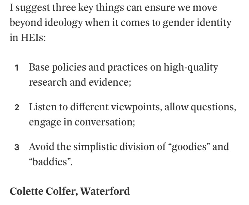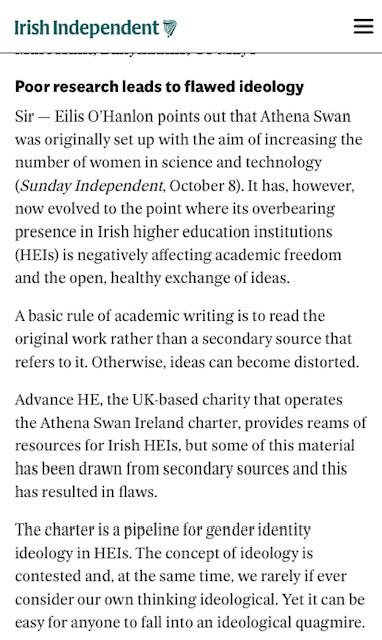 I’m now in the throes of deeper research into Athena Swan and its impact on Irish universities. Research is ongoing. I’ve heard that there’s a consensus in some places that I’m a ‘religious nut’. That just amuses me (because I’m not). The more I learn about how ideologies operate, the more I understand the way this topic is playing out. Yesterday, my letter about ways to move beyond ideologies was published in the Sunday Independent.